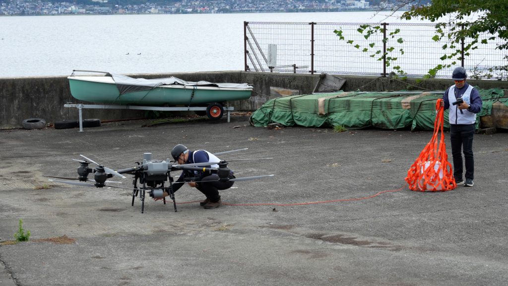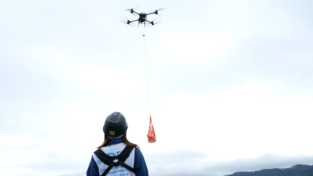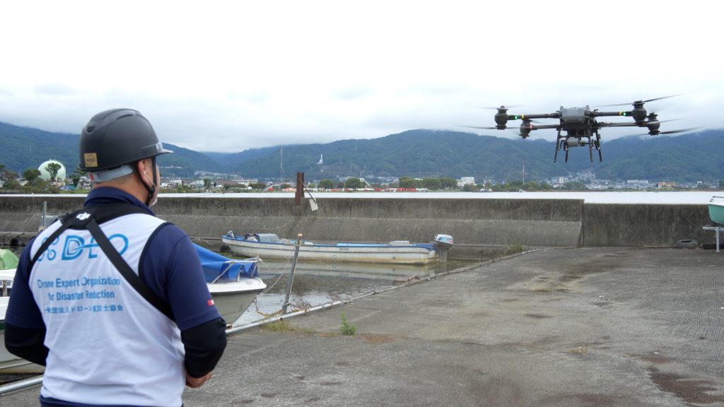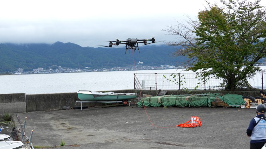 私達ドローン減災士協会 長野支部は、機体や関連機材の展示に加え、今年はFlyCart30を使ったドローンでの物資搬送訓練を行いました。