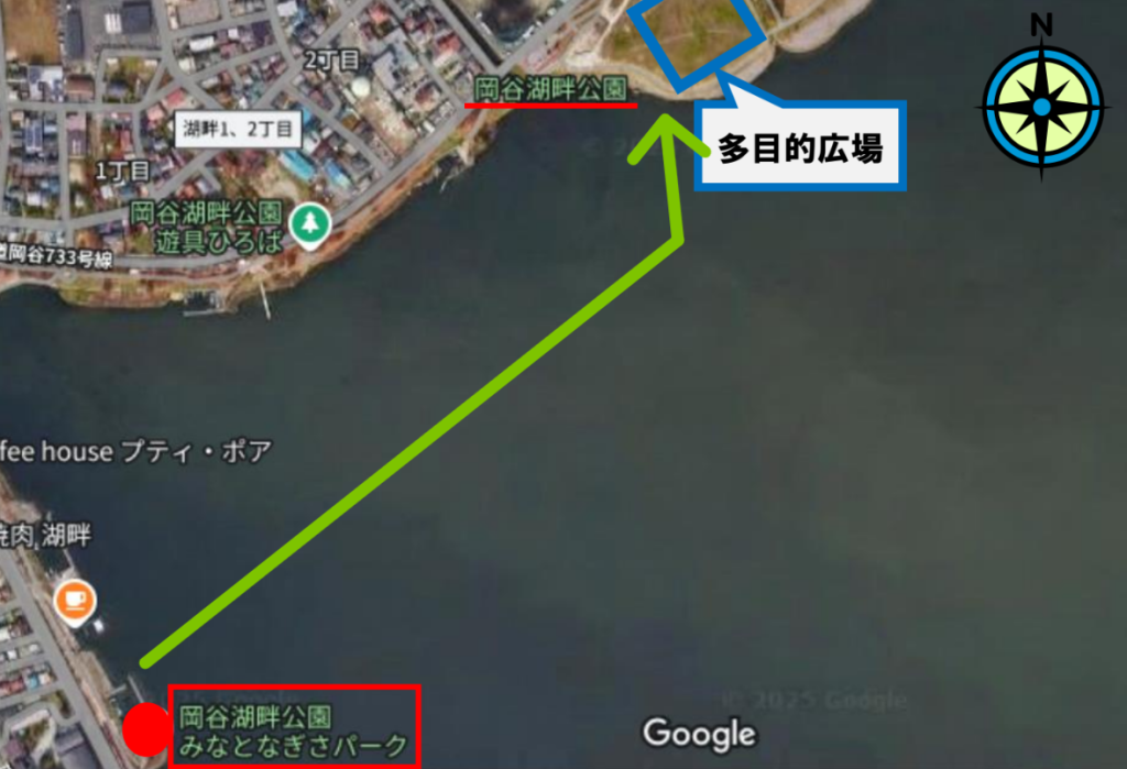 航路:みなとなぎさパーク(下図左下)から離陸し、諏訪湖の上を通り多目的広場(下図右上・訓練主会場)に着荷および着陸